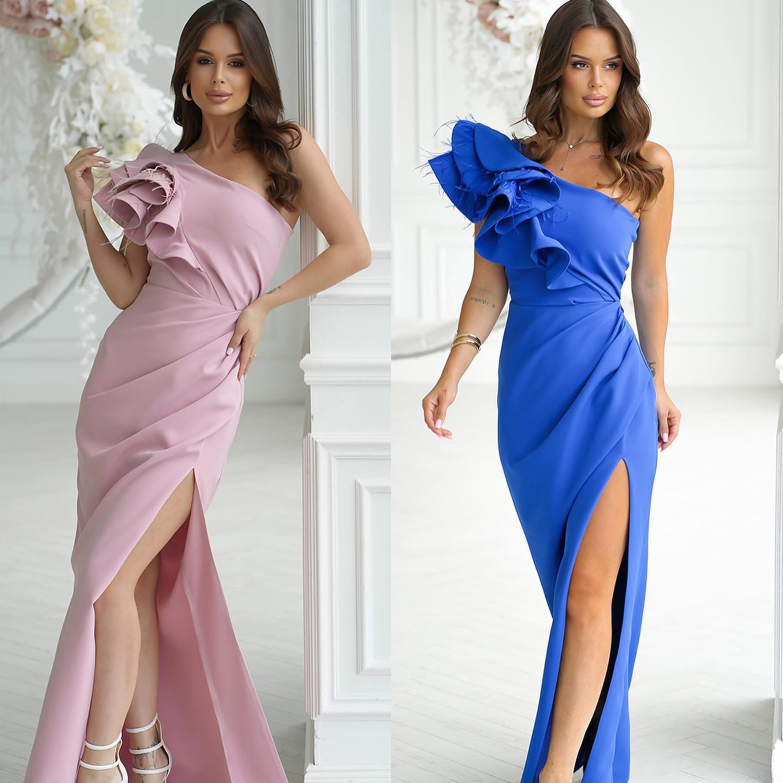 one shoulder maxi dress with feathersone shoulder maxi dress with feathers