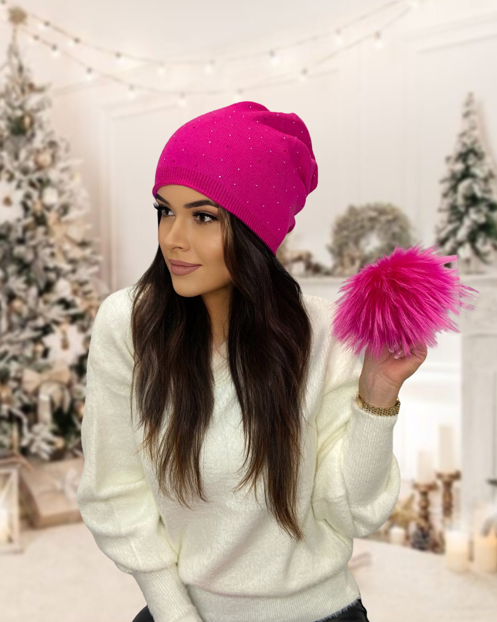Pink winter hat with detachable fur pom pom