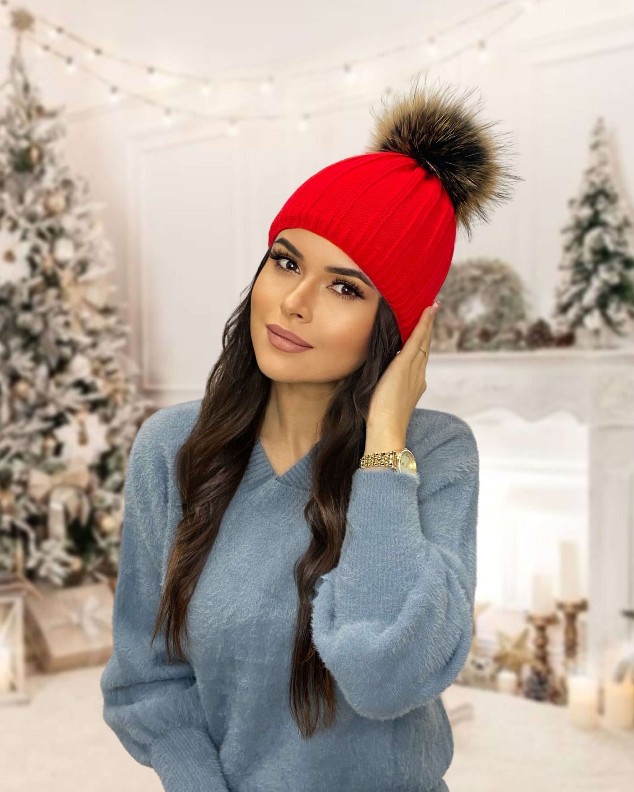 red winter hat with fur pom pom