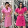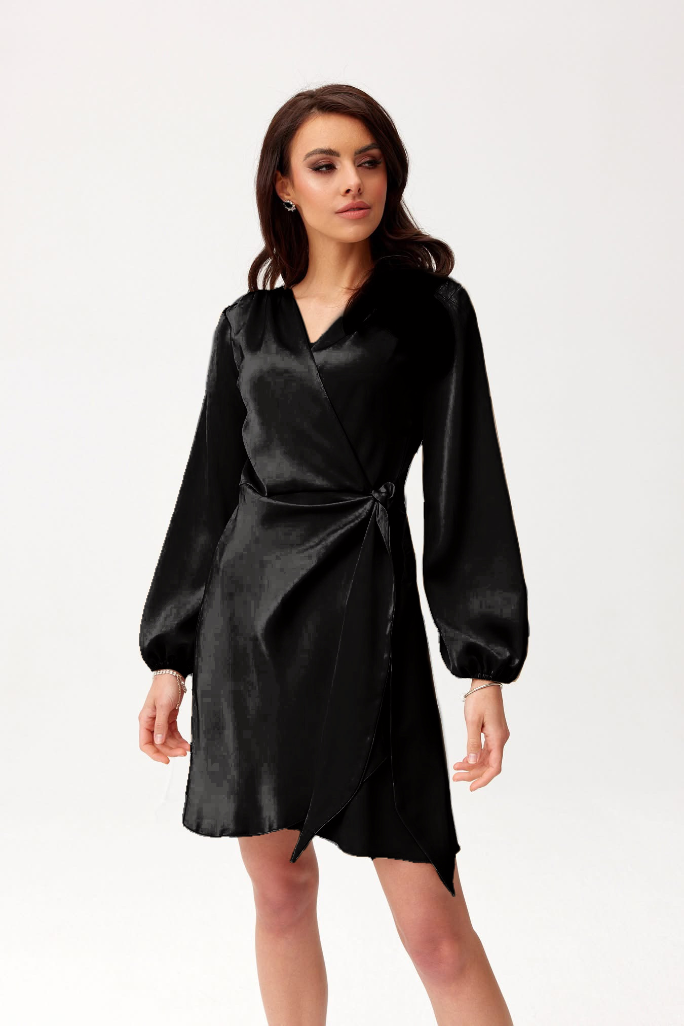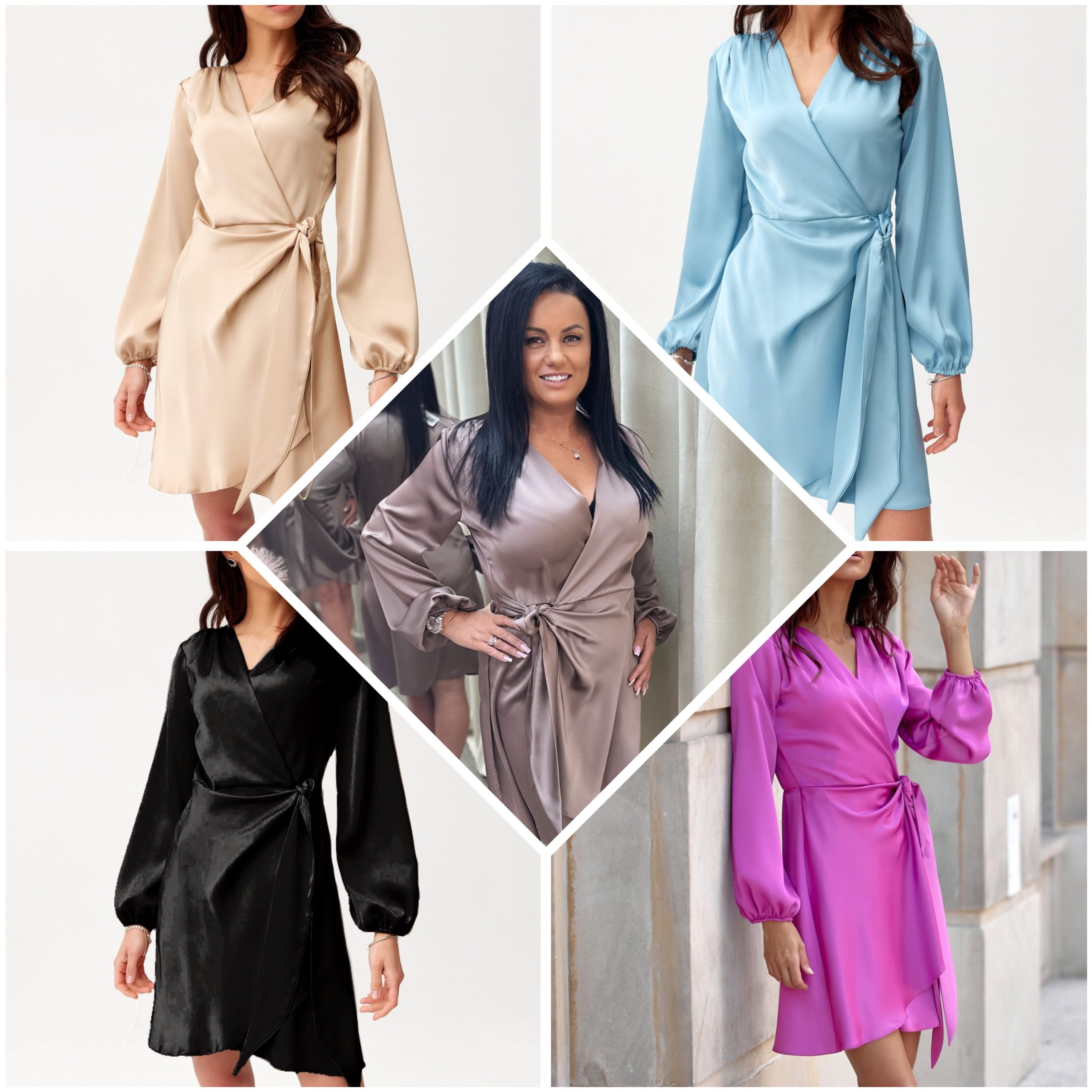 Introducing our Stylish Satin Wrap Mini Dress, designed for the modern woman who loves to make a statement. Available in elegant beige, soft blue, vibrant fuchsia, and classic black, this dress features a flattering wrap design and playful balloon sleeves.