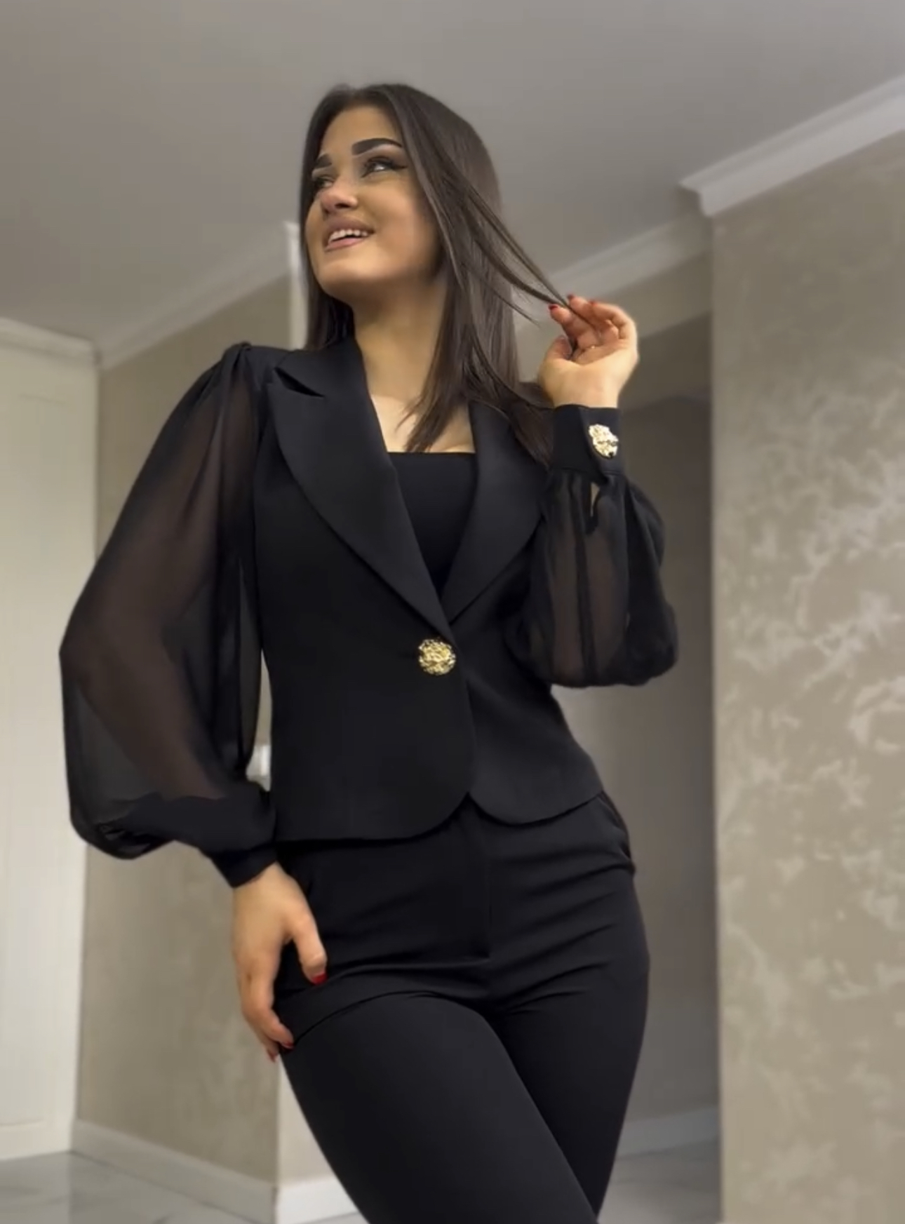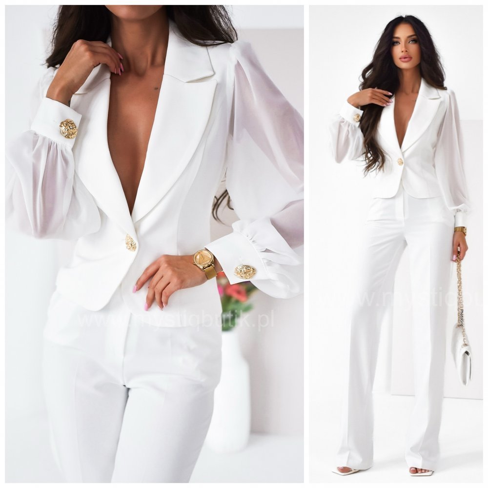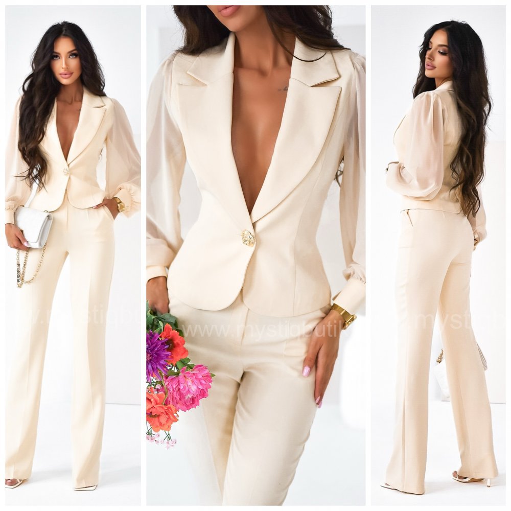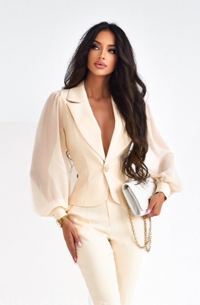 A unique women’s suit consisting of a beautiful blazer with chiffon sleeves and trousers with straight legs.