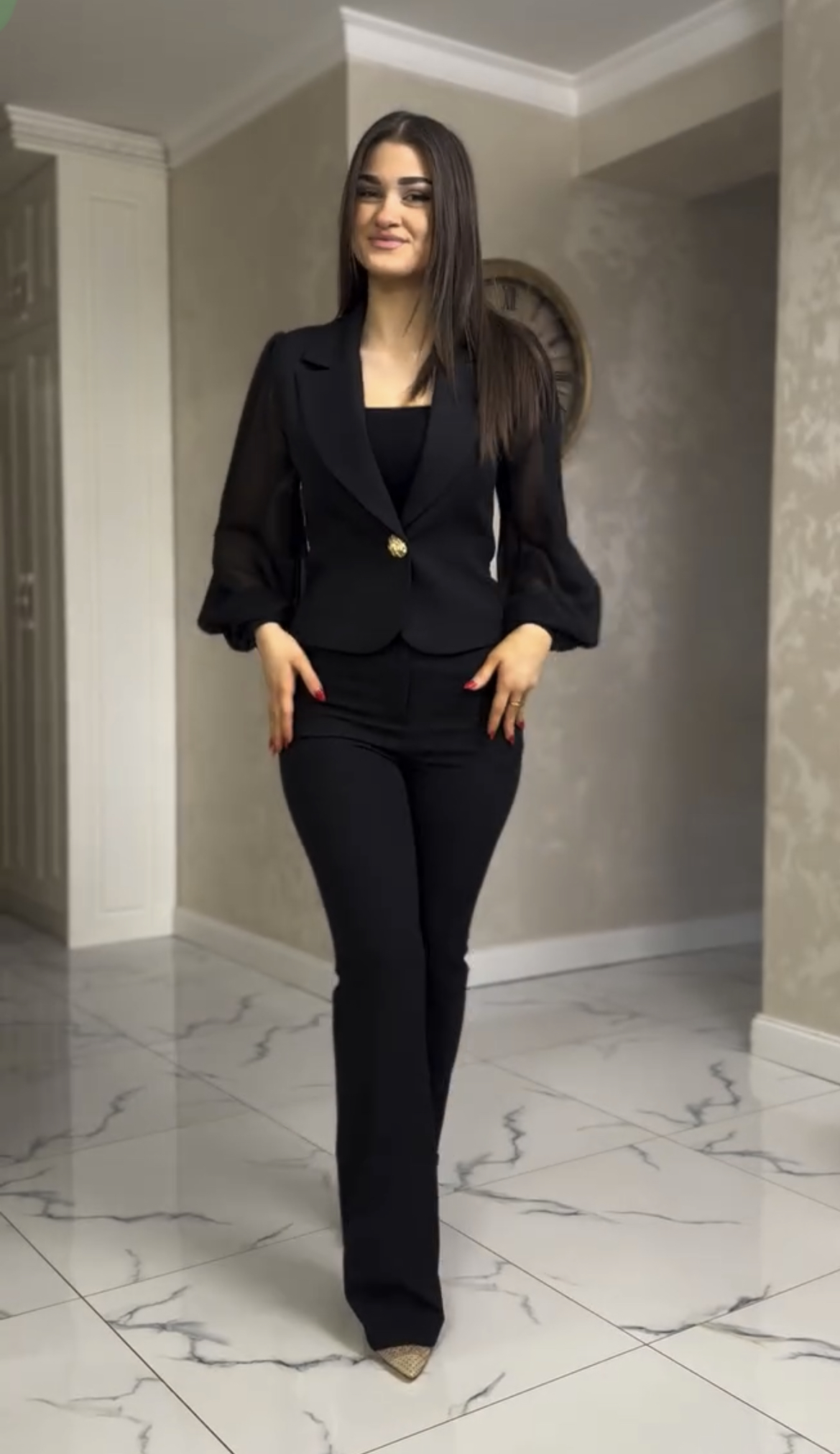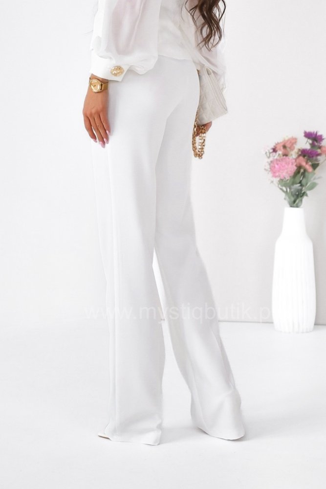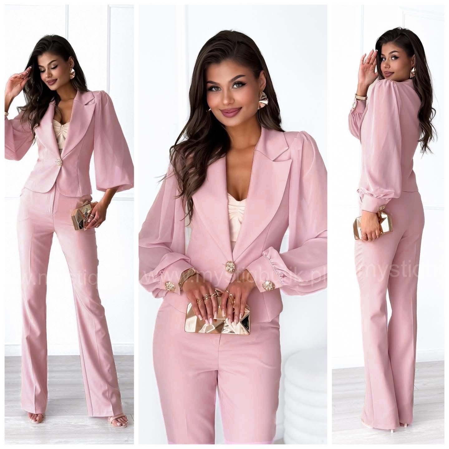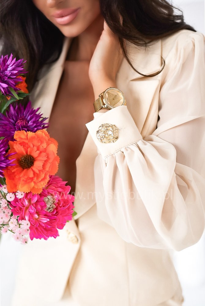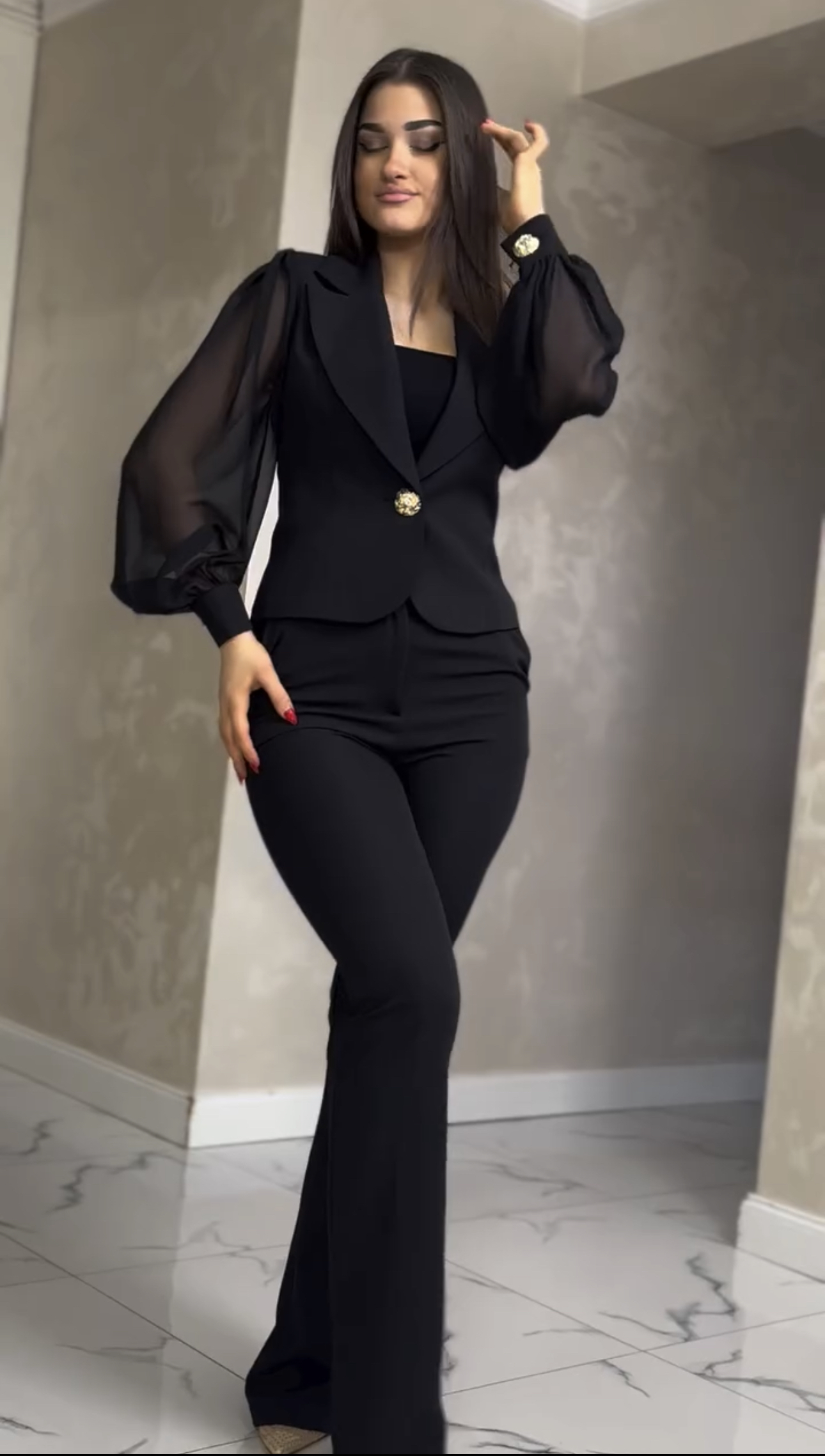 A unique women’s suit consisting of a beautiful blazer with chiffon sleeves and trousers with straight legs.